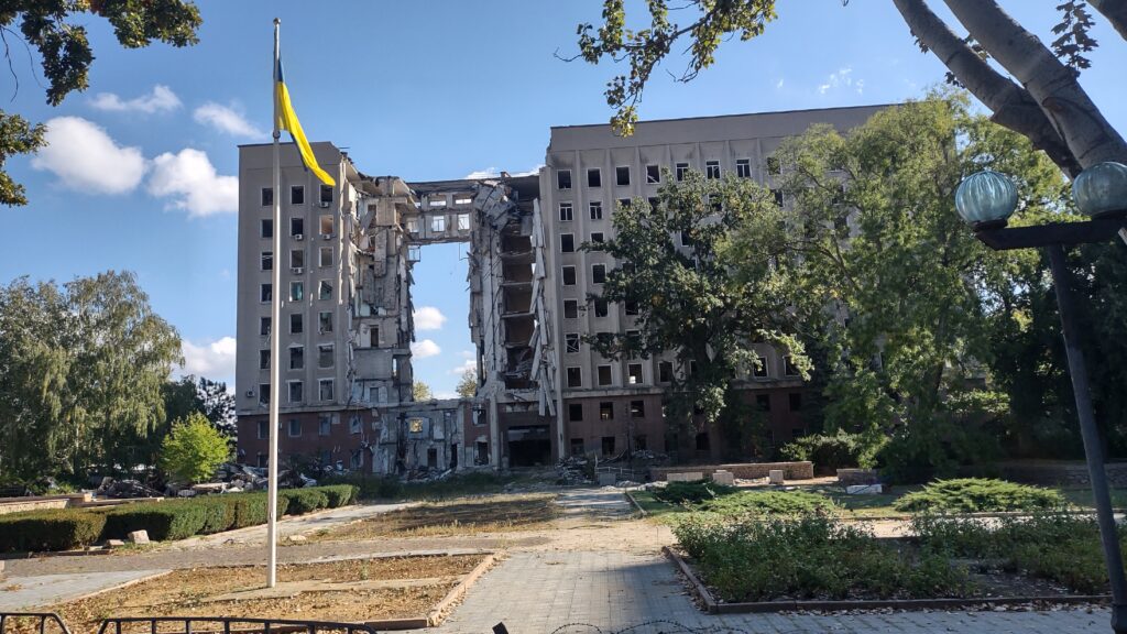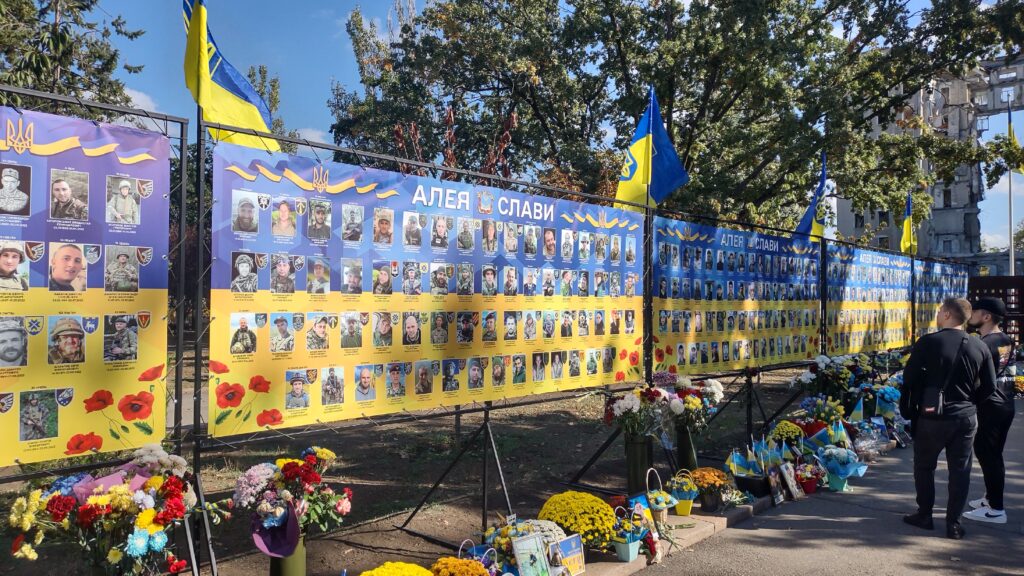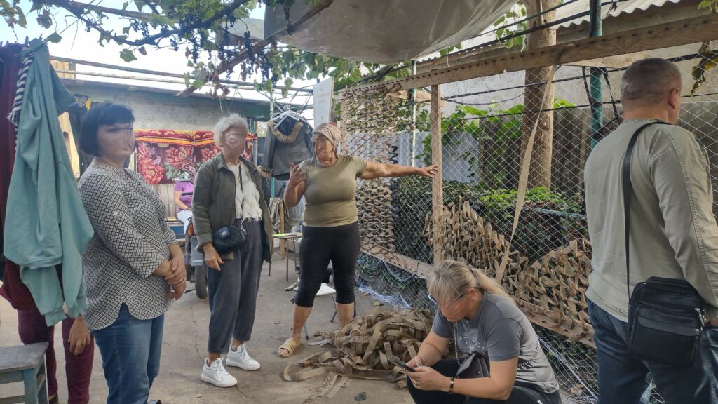 Potem przyszedł czas na zwiedzanie miasta, chociaż lepiej byłoby napisać: oglądanie zniszczeń dokonanych przez raszystów. Naszym gospodarzom bardzo zależało, żebyśmy zobaczyli co z ich miastem zrobili okupanci. Opowiadali nam o dniach, kiedy armia wroga podeszła pod samo miasto, jak wóczas wyglądało ich życie. Przy tej okazji przeszliśmy Aleją Sławy, czyli wzdłuż zdjeć poległych mieszkańców. Zawsze jestem nimi głęboko poruszony, szczególnie, że oprowadzający mnie ukraińscy przyjaciele przy poszczególnych portetach mówią „O, tego znałem, świetny gość”, albo „Z tym chodziłem do klasy”, „Tego spotykałem na imprezach”. Po obejrzeniu miasta pojechaliśmy w stronę Chersonia, żeby zobaczyć zniszczenia, jakich dokonała rosja w okupowanych wsiach. Zajechaliśmy również do jednej z mniej zniszczonych, gdzie grupa kobiet mieszka w zachowanym domu i całe dnie wyplata siatki maskujące. Nasza mikołajewska asocjacja pomaga im materialnie. Zostaliśmy poczęstowani arbuzami, które z okolic Chersonia przywieźli żołnierze je odbierający.