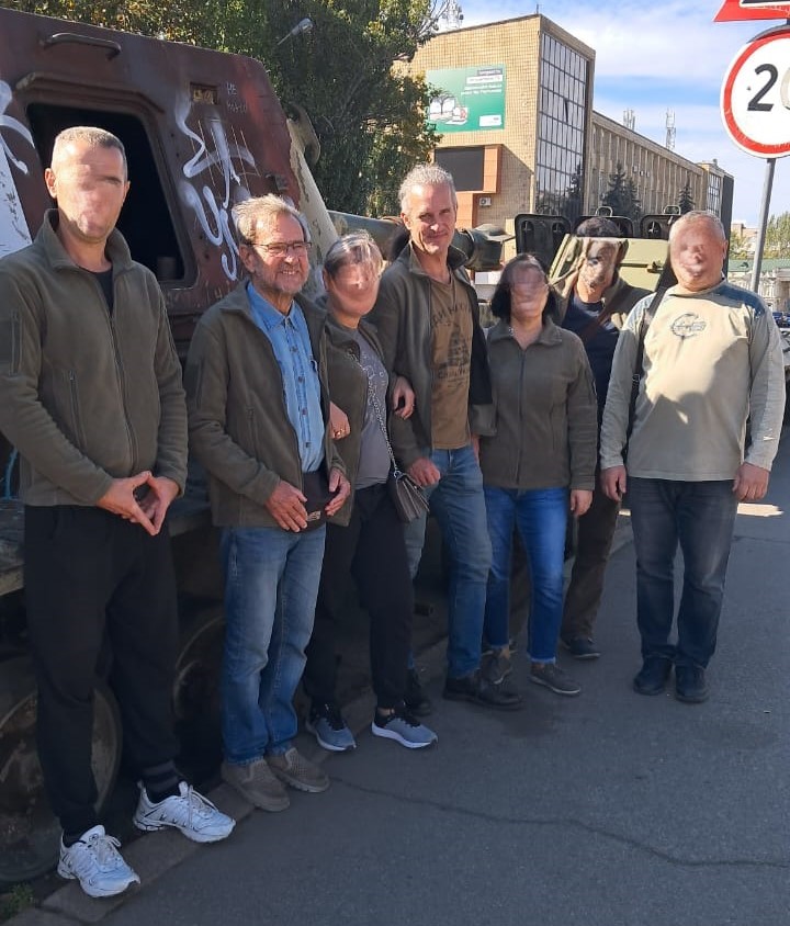 Potem przyszedł czas na zwiedzanie miasta, chociaż lepiej byłoby napisać: oglądanie zniszczeń dokonanych przez raszystów. Naszym gospodarzom bardzo zależało, żebyśmy zobaczyli co z ich miastem zrobili okupanci. Opowiadali nam o dniach, kiedy armia wroga podeszła pod samo miasto, jak wóczas wyglądało ich życie. Przy tej okazji przeszliśmy Aleją Sławy, czyli wzdłuż zdjeć poległych mieszkańców. Zawsze jestem nimi głęboko poruszony, szczególnie, że oprowadzający mnie ukraińscy przyjaciele przy poszczególnych portetach mówią „O, tego znałem, świetny gość”, albo „Z tym chodziłem do klasy”, „Tego spotykałem na imprezach”. Po obejrzeniu miasta pojechaliśmy w stronę Chersonia, żeby zobaczyć zniszczenia, jakich dokonała rosja w okupowanych wsiach. Zajechaliśmy również do jednej z mniej zniszczonych, gdzie grupa kobiet mieszka w zachowanym domu i całe dnie wyplata siatki maskujące. Nasza mikołajewska asocjacja pomaga im materialnie. Zostaliśmy poczęstowani arbuzami, które z okolic Chersonia przywieźli żołnierze je odbierający.