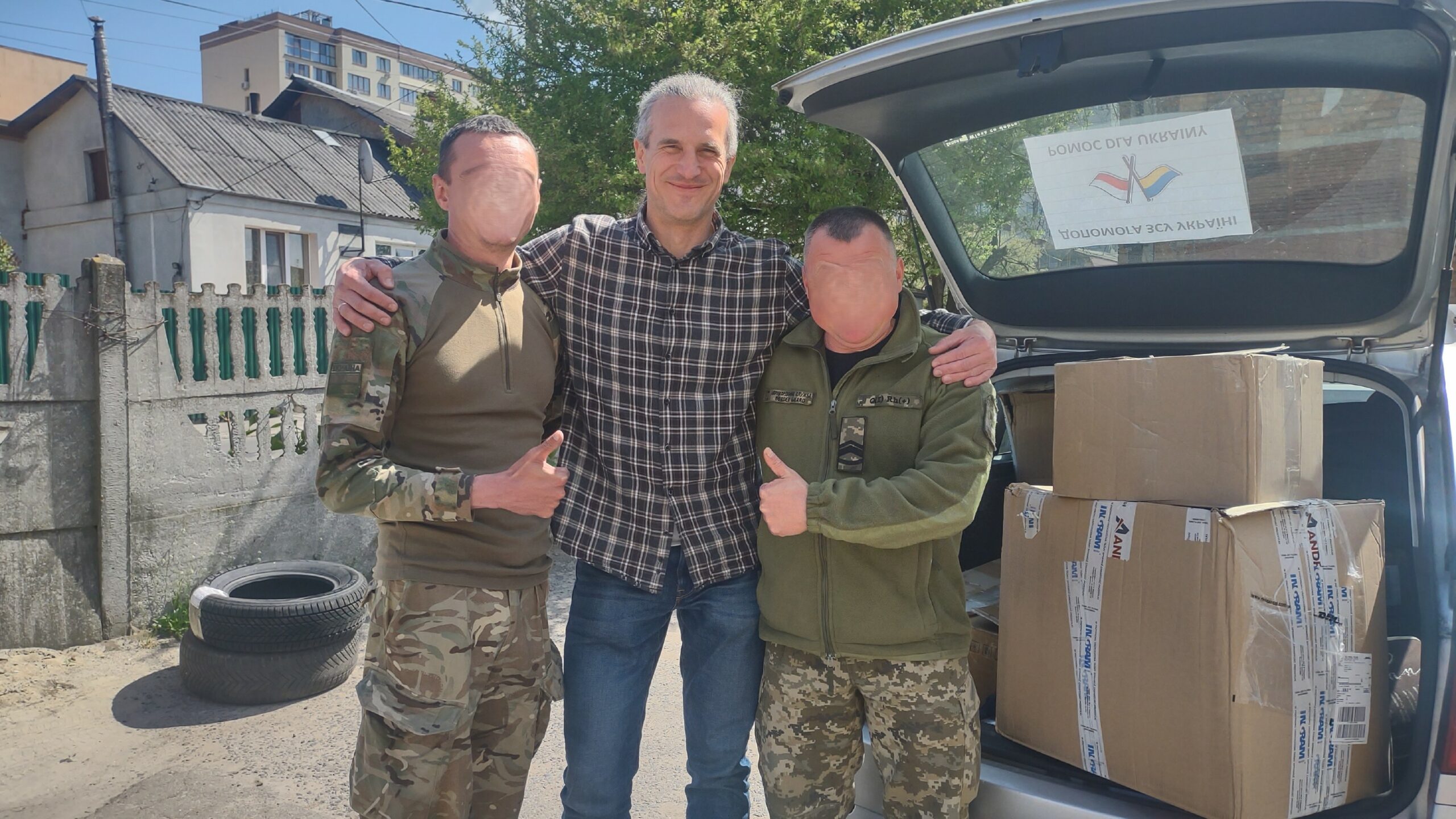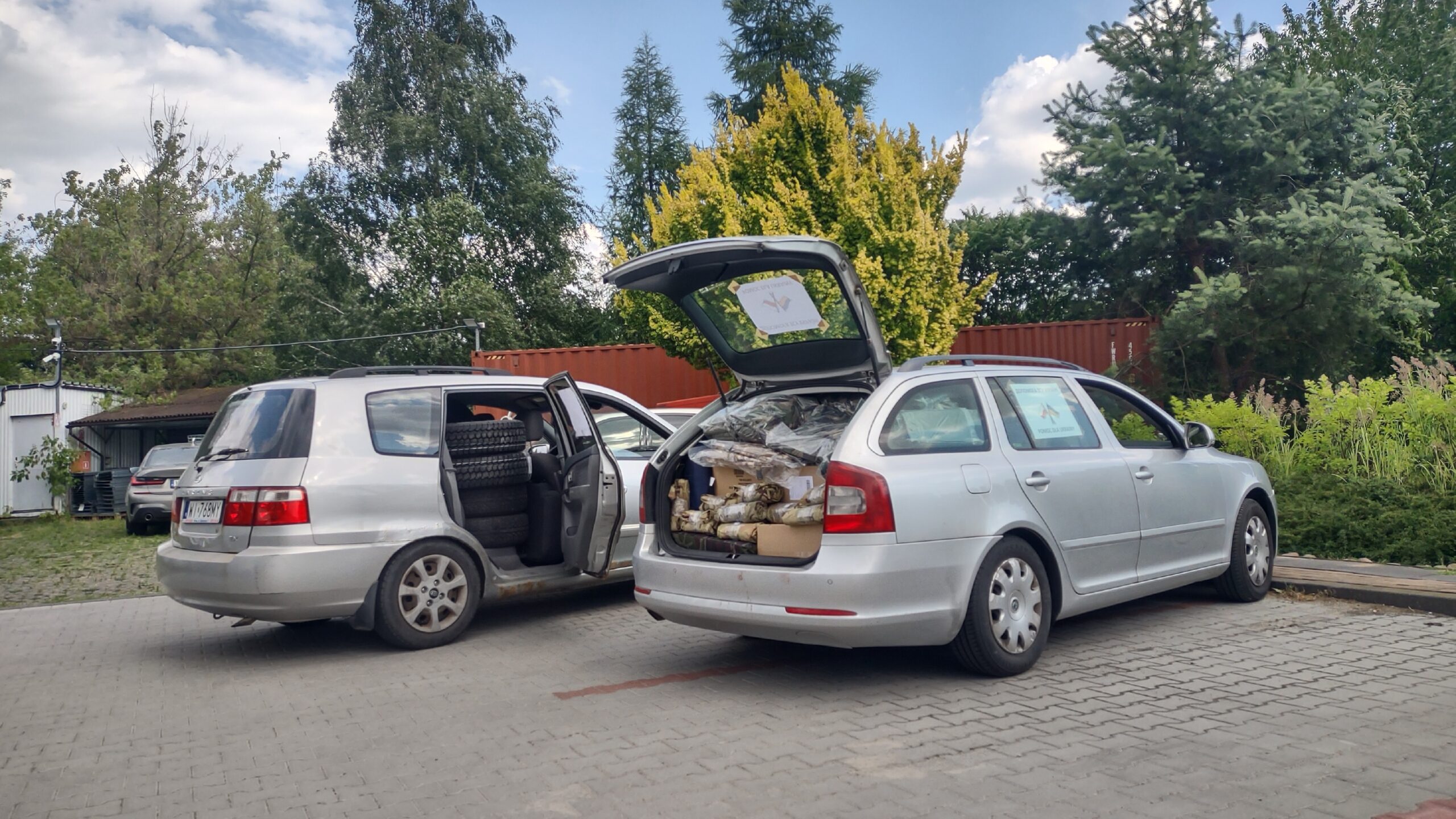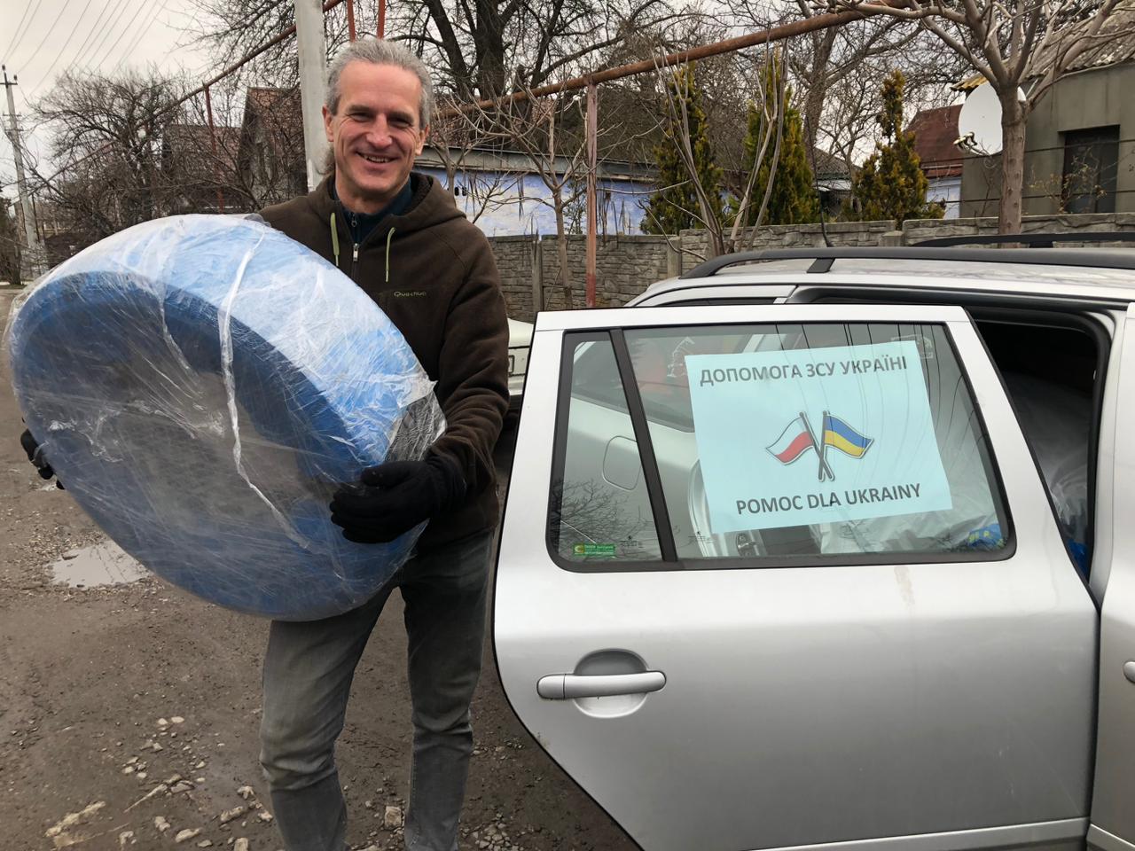Polski ochotnik medyczny wraz z ukraińskim kolegą przejmuja auto w Ukrainie / Polish paramedic volunteer with his Ukrainian colleague are taking over the car in Ukraine
